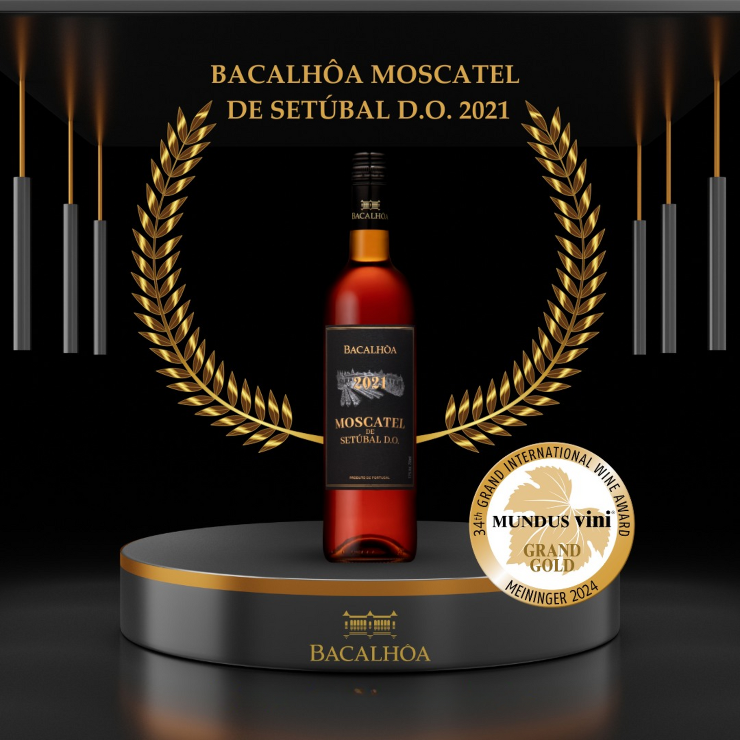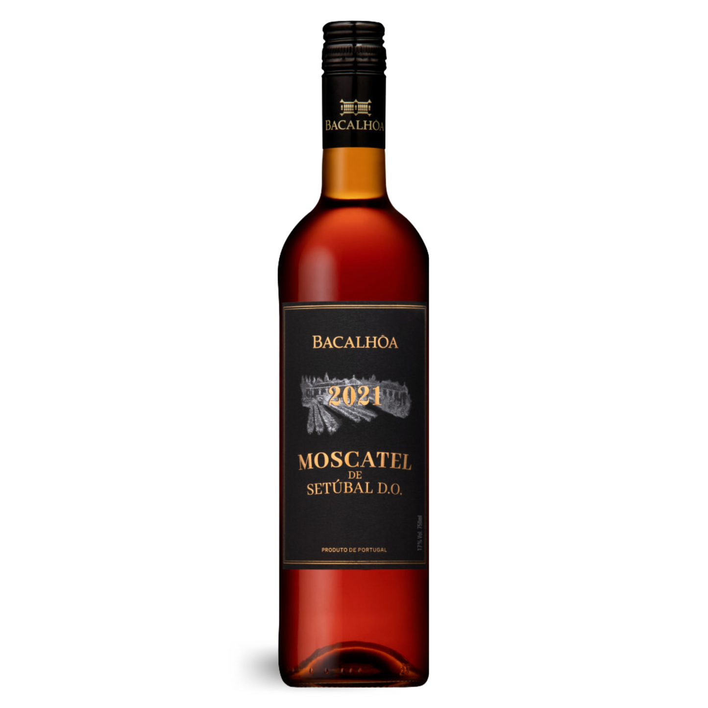 Eine Flasche 2021 Bacalhôa Moscatel Setúbal D.O. Dessertwein. Die Flasche hat ein schwarzes Etikett mit goldener und weißer Schrift. Der Wein hat eine reiche, bernsteinfarbene Tönung.