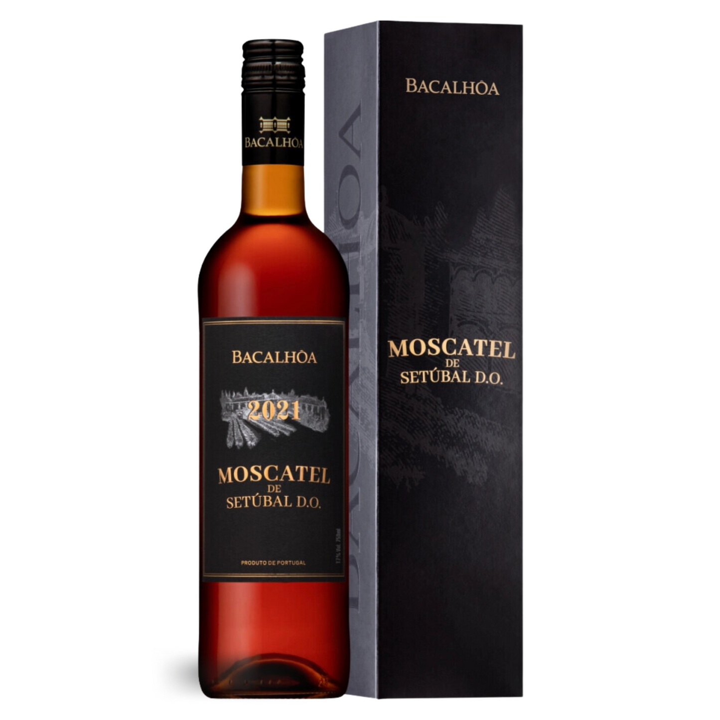Eine Flasche 2021 Bacalhôa Moscatel Setúbal D.O. Dessertwein. Die Flasche hat ein schwarzes Etikett mit goldener und weißer Schrift. Der Wein hat eine reiche, bernsteinfarbene Tönung. Daneben steht eine passende schwarze, eckige Verpackung.