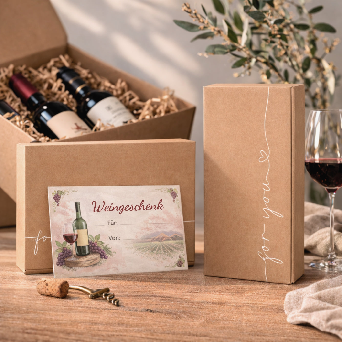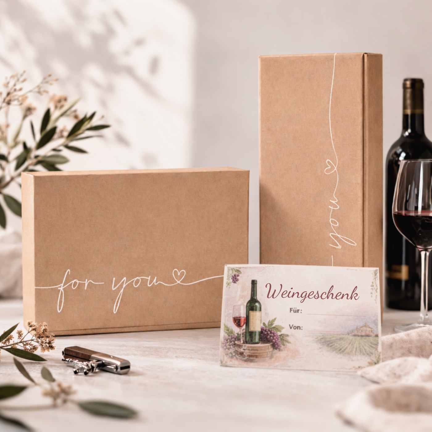 Die Weine werden von uns direkt in der Geschenkbox verpackt, sodass dein Weingeschenk sofort bereit zum Verschenken ist.