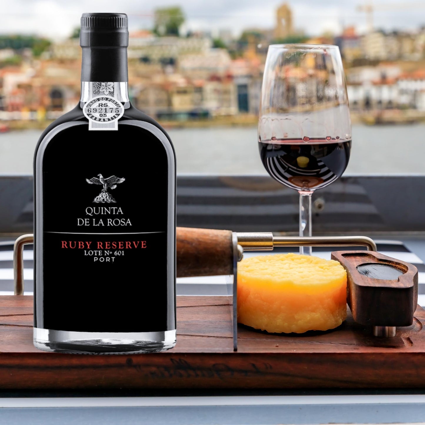 Ruby Reserve, Portwein vom Weingut Quinta de la Rosa. Bild am Douro mit Landschaft im Hintergrund und einem Portweinglas mit Käse daneben.